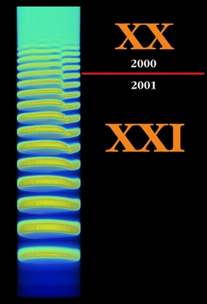The figure on left shows an early result of the IDNB model. From historical point of view this is a noteworthy picture, beacuse this simulation has been started on new year's eve of 2000 on a four-processor cluster (and then I went to drink some champagne with my friends). This means that about the first three precipitate zones were computed in the 20th century, while the subsequent ones belong to the 21st century history of Liesegang patterning.